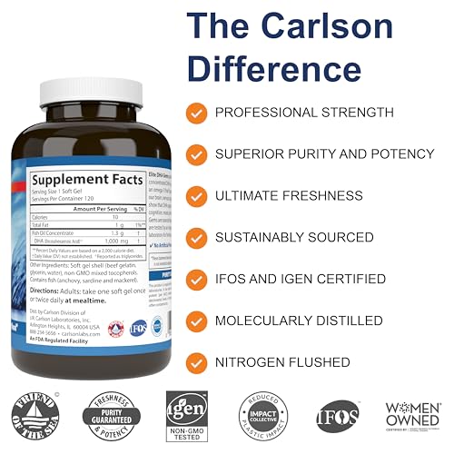 Carlson - Elite DHA Gems, 1000 mg DHA, Wild Caught, Sustainably Sourced, Brain Function & Healthy Vision, 120 Softgels