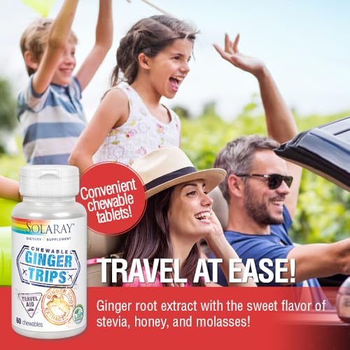 SOLARAY Ginger Trips Travel Aid | Root Extract | Healthy Digestive Support w/Honey, Stevia & Molasses | 60 Chewables