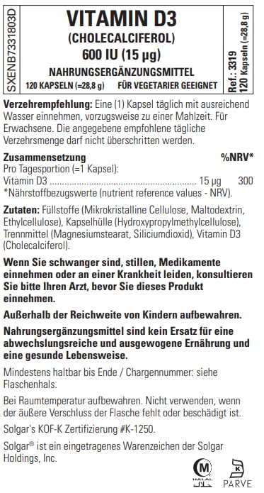 Solgar Vitamin D3 (Cholecalciferol) 15 mcg (600 IU), 120 Vegetable Capsules - Helps Maintain Healthy Bones & Teeth - Immune Support - Non-GMO, Gluten Free, Dairy Free, Kosher, Halal - 120 Servings