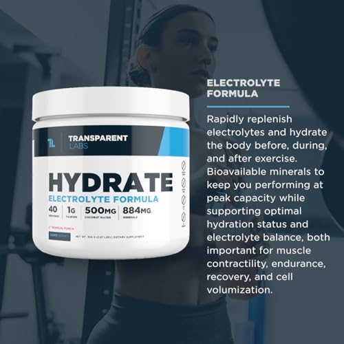 Transparent Labs Hydrate Naturally Sweetened Electrolytes Powder - Hydration Powder Electrolytes with Coconut Water, Calcium, Taurine, & Potassium - 40 Servings, Tropical Punch