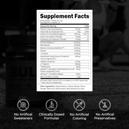 Transparent Labs Bulk Black Pre Workout - Clinically Dosed, Naturally Sweetened Preworkout for Men and Women with Beta Alanine Powder, Citrulline Malate, & Caffeine- 30 Servings, Blue Raspberry