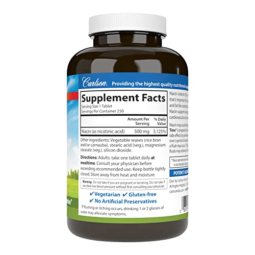 Carlson - Niacin - Time, Time-Release Niacin 500 mg, Energy Production, Heart Health & Nerve Function, 250 Tablets