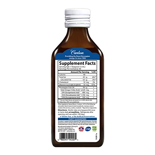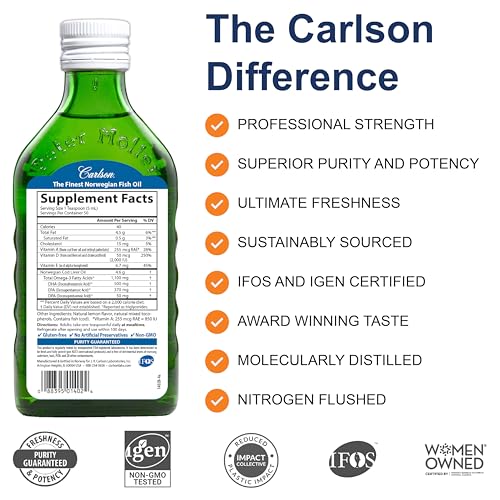 Carlson - Super D Omega-3, Wild-Caught Norwegian Arctic Cod Liver Oil, 2000 IU (50 mcg) Vitamin D3, 1100 mg Omega-3s, Sustainably Sourced Nordic Fish Oil Liquid, Lemon, 250 ml