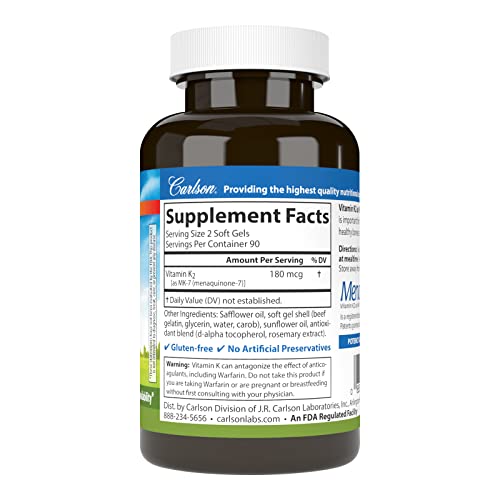Carlson - Vitamin K2 MK-7 (Menaquinone), 180 mcg, Bone Support, Calcium Bioavailability, K2 Vitamin, Vitamin K-2, 180 Softgels