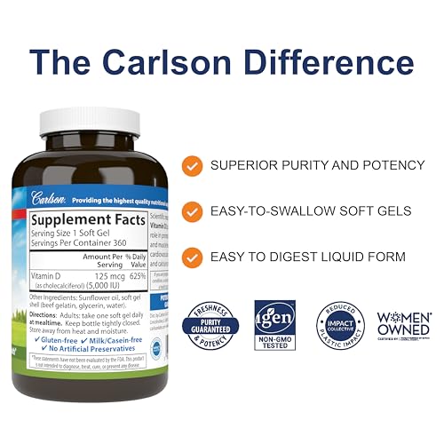 Carlson - Vitamin D3 5000 IU (125 mcg), Bone Health, Muscle Health, Cholecalciferol, Vitamin D Supplements, Vitamin D3 Soft Gels, 360 Softgels