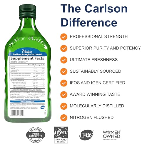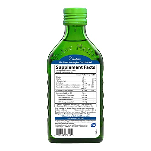 Carlson - Cod Liver Oil, 1100 mg Omega-3s, Wild-Caught Norwegian Arctic Cod-Liver Oil, Sustainably Sourced Nordic Fish Oil Liquid, Unflavored, 500 ml (16.9 Fl Oz)