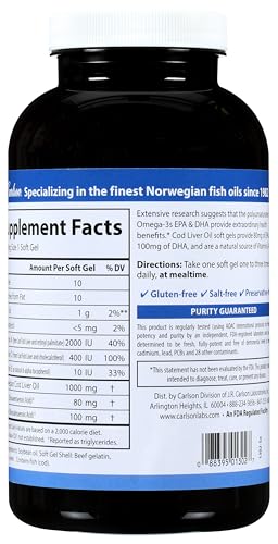 Carlson - Cod Liver Oil Gems, Super 1000 mg, 250 mg Omega-3s, 400 IU (10 mcg) Vitamin D3, Wild Caught Norwegian Arctic Cod Liver Oil, Nordic Fish Oil Capsules, 250 Softgels