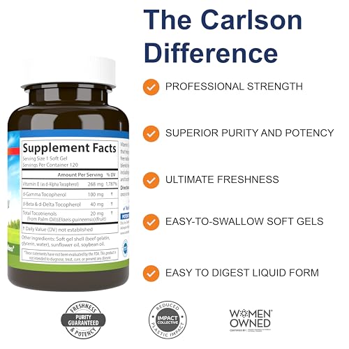 Carlson - E-Gems Elite, 400 IU (268 mg) Vitamin E with Tocopherols & Tocotrienols, Natural-Source, Vitamin E Capsules, Heart Health & Optimal Wellness, Antioxidant, Vitamin E Supplement, 120 Softgels