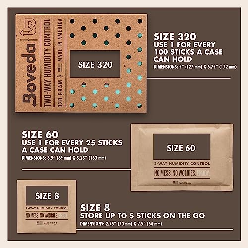 - WHY THIS BOVEDA: Try Boveda 65% for long-term storage & aging; tightly bound premiums that get musty at higher RHs; or if you live in year-round high humidity. Use one 5.25"x3.5" humidifier packet for every 25 TOTAL items your humidifier box can hold. NATURAL INGREDIENTS. Trusted by over 3 million people to protect & maintain items at the perfect humidity level. WE GUARANTEE QUALITY!