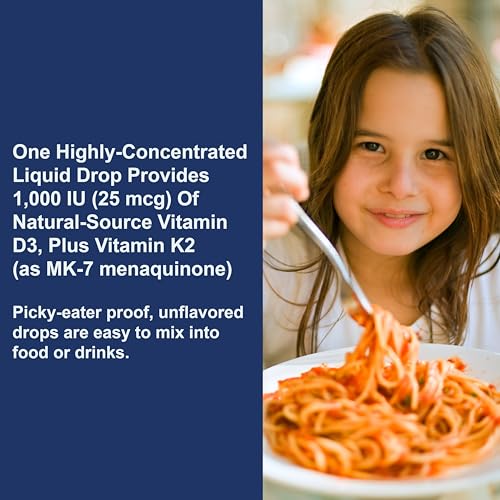 Carlson - Kid's Super Daily D3+K2, 25 mcg (1,000 IU) D3 & 22.5 mcg K2, Vitamin D Drops with Vitamin K2, Liquid Vitamins, 1000 IU Vitamin D3, Heart & Bone Health, 1-Year Supply, Unflavored, 360 Drops