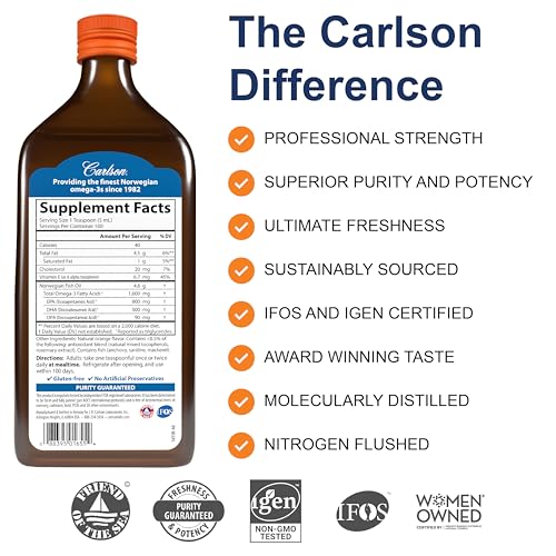 - HEART, BRAIN AND JOINT HEALTH - Each teaspoon of Carlson's liquid fish oil provides 1,600 mg of omega-3s, including EPA and DHA, which support heart, brain, vision, and joint health.