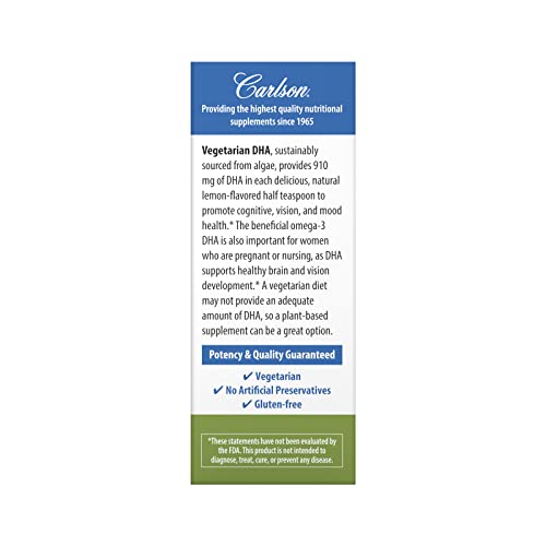 Carlson - Vegetarian DHA, 910 mg DHA, Cognitive Function, Mood Health, Plant-Based, Lemon, 60 mL (2 fl oz)