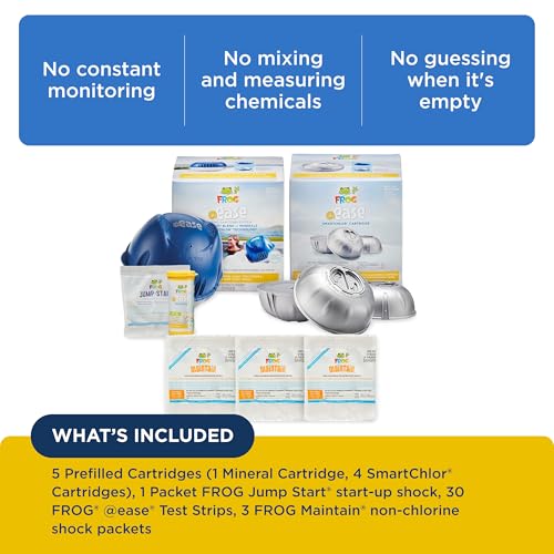 - Comprehensive Sanitization Kit: Includes FROG @ease Floating Sanitizing System, three additional SmartChlor Cartridges and three packs of FROG Maintain non-chlorine shock; provides a complete 4-month solution for maintaining your hot tub’s water quality