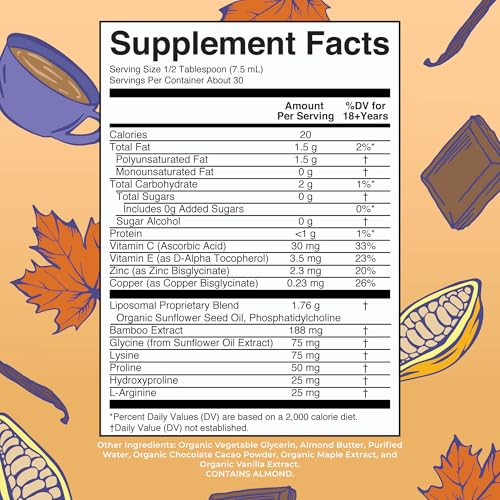 - Collagen Boosting Liposomal: A delicious liposomal to support your bodys ability to make collagen! Our Vegan Collagen Booster Liposomal contains 5 amino acids as well as nutrients such as vitamins C & E, zinc, copper, and silica! Support your skin and joint health with this delicious Maple Hot Cocoa liposomal.