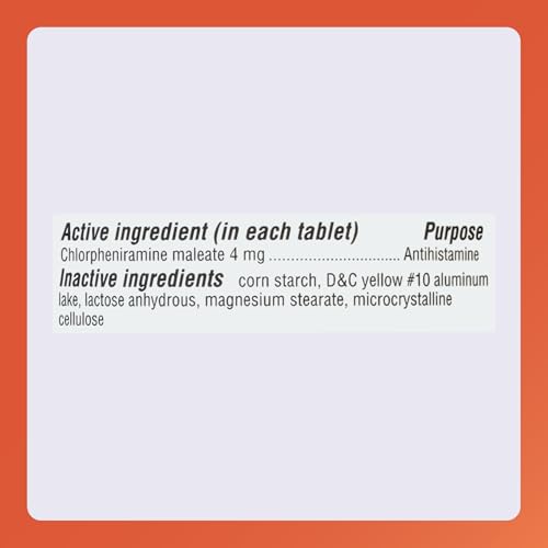 - ACTIVE INGREDIENT: Each tablet contains 4 mg of chlorpheniramine maleate, an antihistamine.
